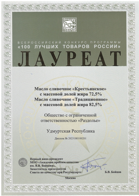 25 декабря 2025 года в Доме Правительства Удмуртской Республики состоялась церемония награждения призеров конкурса «100 лучших товаров России» с участием Председателя Правительства Удмуртской Республики Романа Ефимова и Министра промышленности и торговли Удмуртской Республики Виктора Лашкарева.