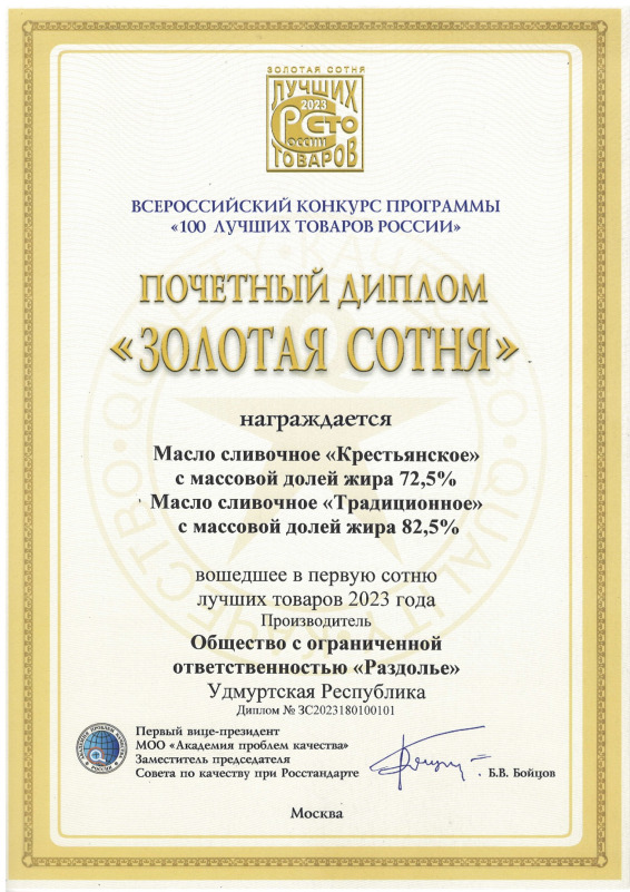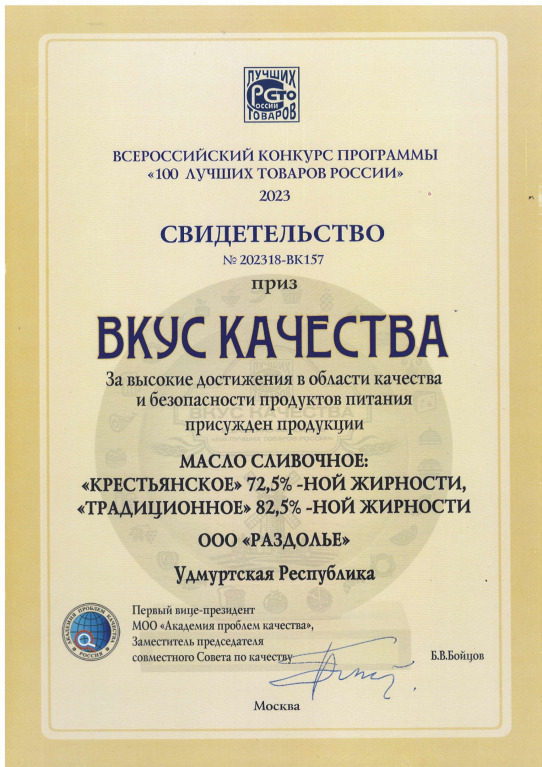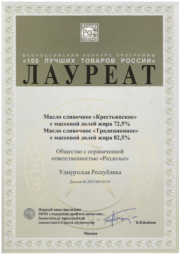 Продукция предприятия «Раздолье» («Играмолоко») - сливочное масло «Крестьянское» и «Традиционное» удостоена высшей награды конкурса «100 лучших товаров России» - приза «Вкус качества». Также получены дипломы "Лучшие из лучших"- Золотая сотня-2023 года». Почётных знаков «За достижения в области качества-2023» удостоен генеральный директор предприятия «Раздолье» - Алексей Грязнов. Свою награду "Дипломант" получили фруктовые Йогурты с массовой долей жира 2,5%.