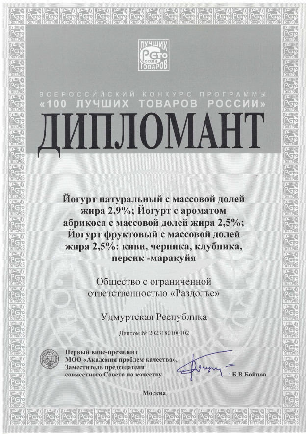 В этом году 20 удмуртских предприятий представили на конкурс качества 37 видов своей продукции и получили 13 золотых и 24 серебряных диплома конкурса "100 лучших товаров России". В числе призеров самые активные участники конкурса - ведущие предприятия удмуртской промышленности. Продукция под ТМ "ИГРАМОЛОКО" также была удостоена наград.